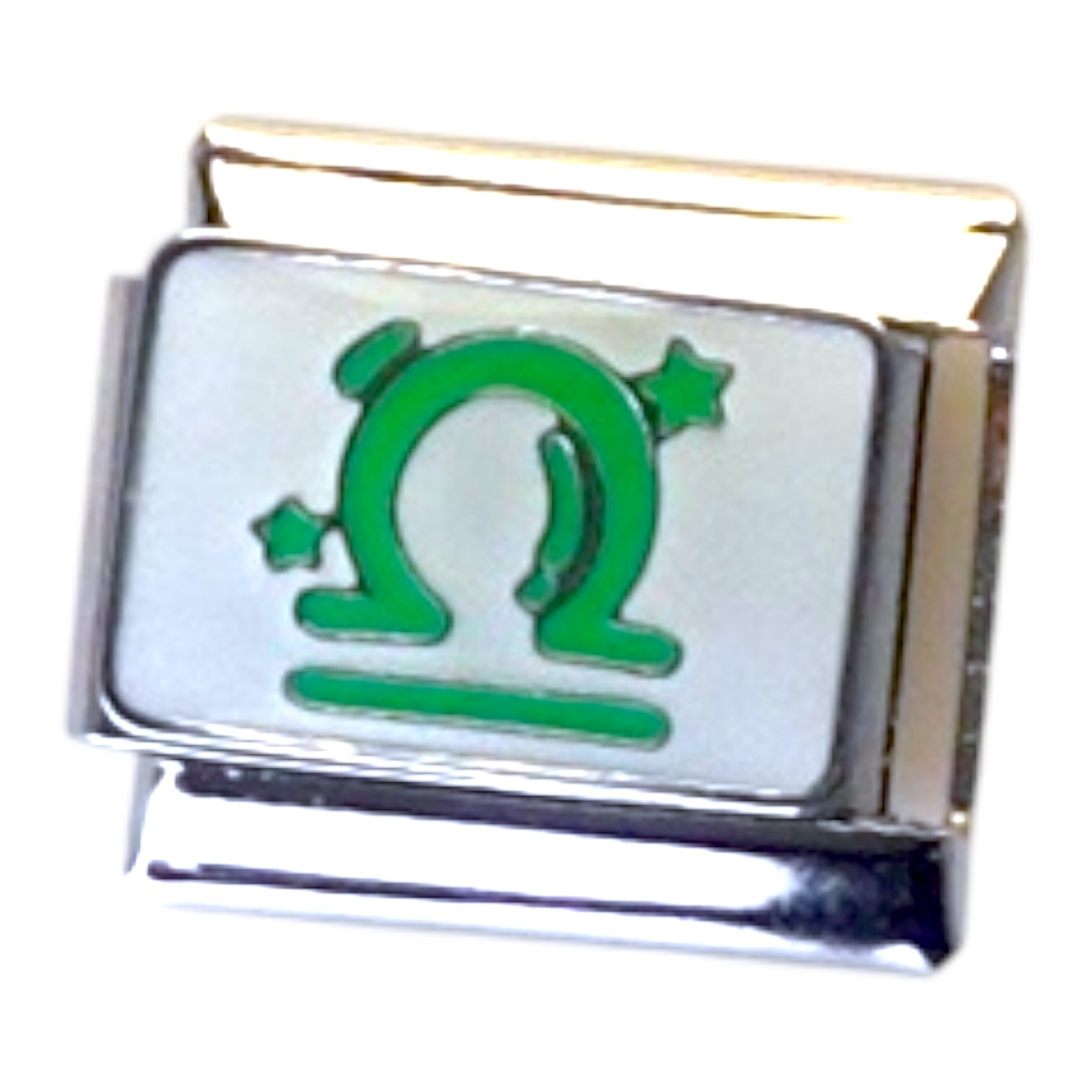 Celebrate your Libra zodiac sign with this stylish Green Libra Italian Charm. Featuring the iconic Libra symbol in vibrant green enamel, accented with stars, this charm is set against a polished silver-tone stainless steel base. Ideal for astrology lovers, this 9mm charm links easily with others to create a personalized bracelet that showcases your astrological identity.