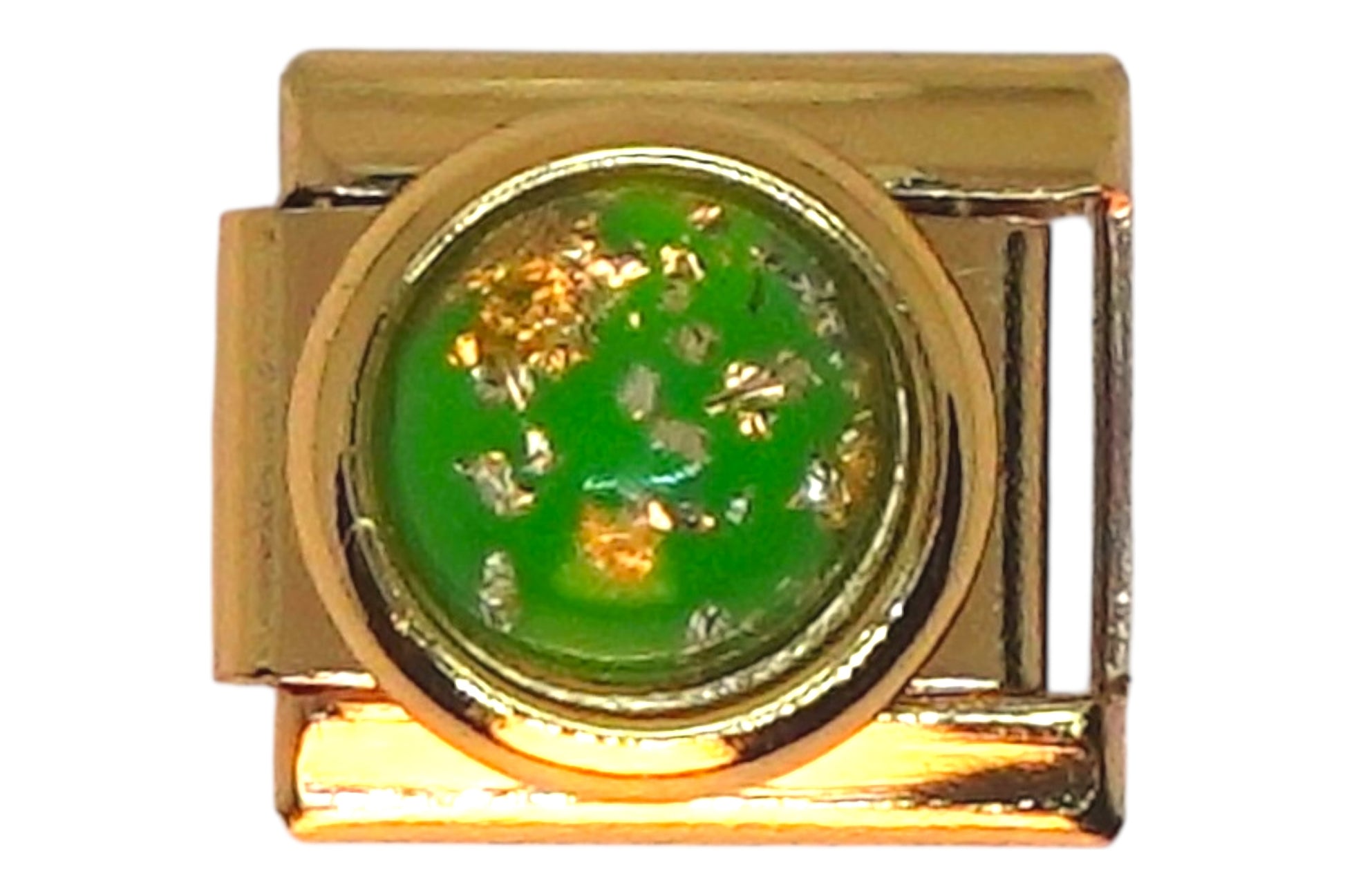 Add a vibrant touch to your bracelet with our Green Sparkle Gold Italian Charm. Featuring a shimmering green resin center with golden flakes, this 9mm stainless steel charm brings a unique and lively accent to your collection. Perfect for adding a hint of sparkle and color. This listing is for 1 charm.